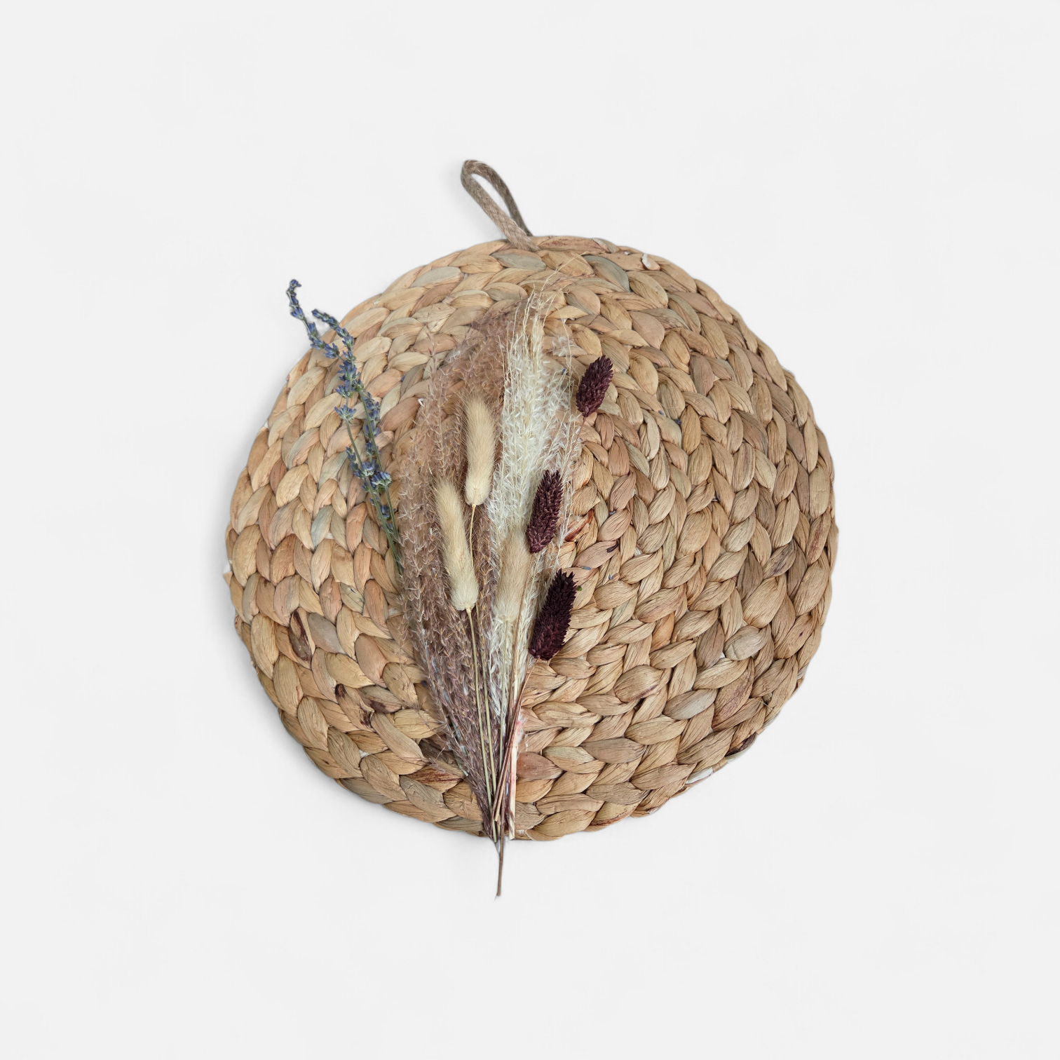 Bring warmth and natural charm into your home with this beautifully crafted boho wall décor set. Made from woven natural fibers and decorated with delicate dried flowers, this piece adds texture and earthy elegance to any interior.