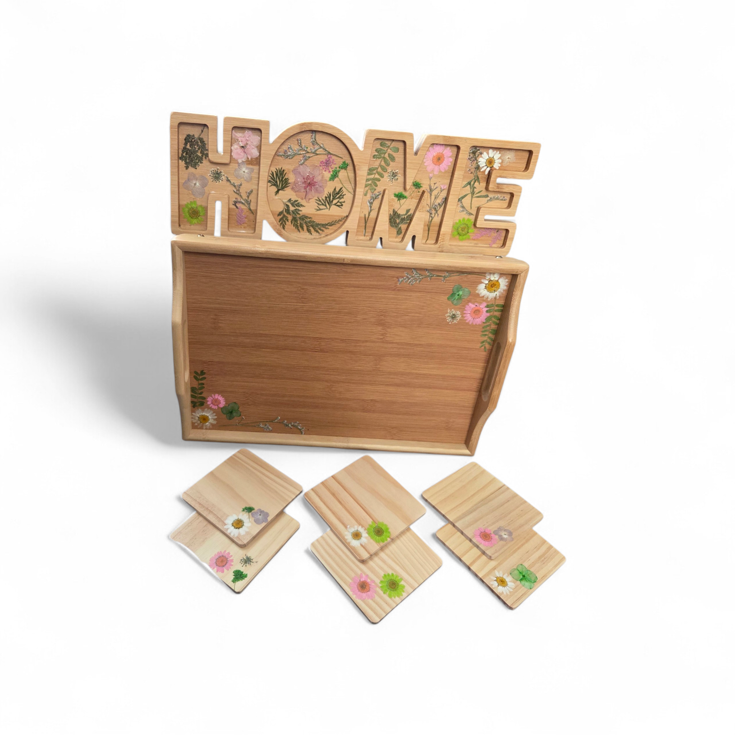 This coordinated set includes a serving tray, six matching coasters, and a decorative “HOME” sign — perfect for everyday use or as a thoughtful gift.